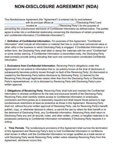 A Non-Disclosure Agreement, also sometimes called a Confidentiality Agreement, is a document used when two people or companies enter into a new (or potential) business relationship. A Non-Disclosure Agreement (NDA) is a legally enforceable contract that establishes confidentiality between two parties—the owner of protected information and the recipient of that information. From technology to trade secrets, confidentiality agreements are helping entrepreneurs everywhere to stake their claim and protect their ideas and investments.